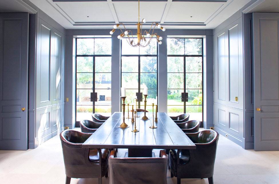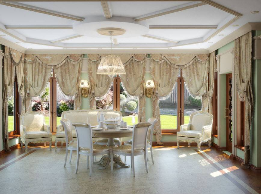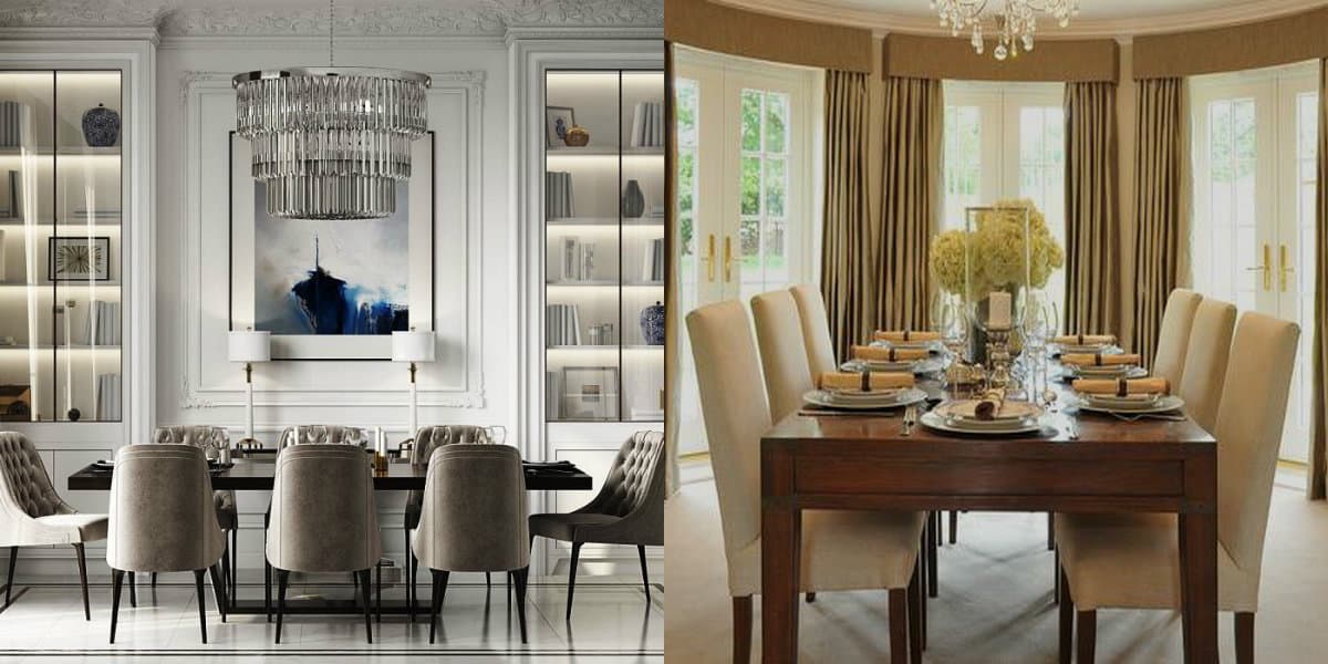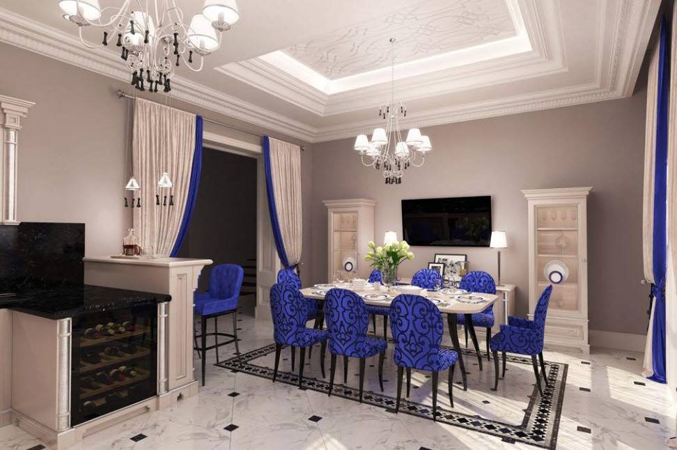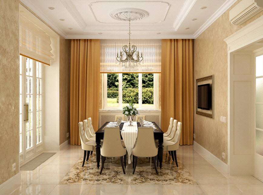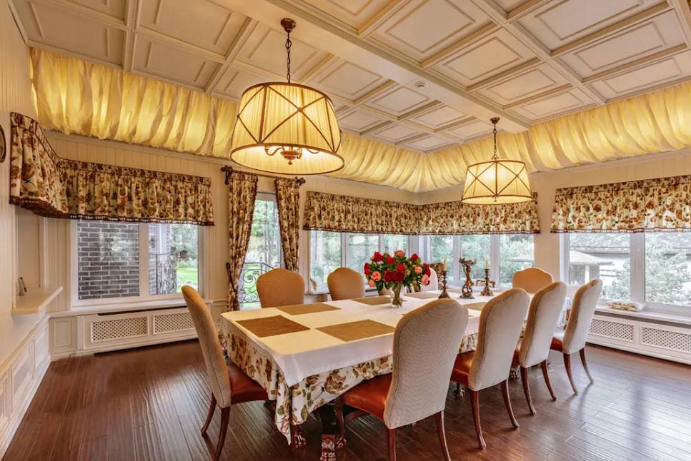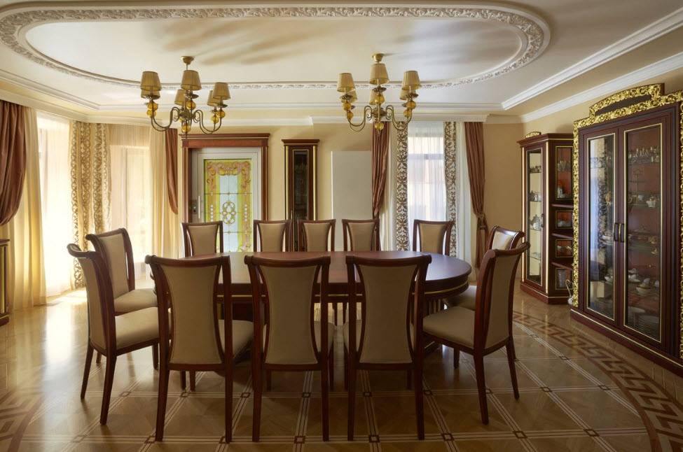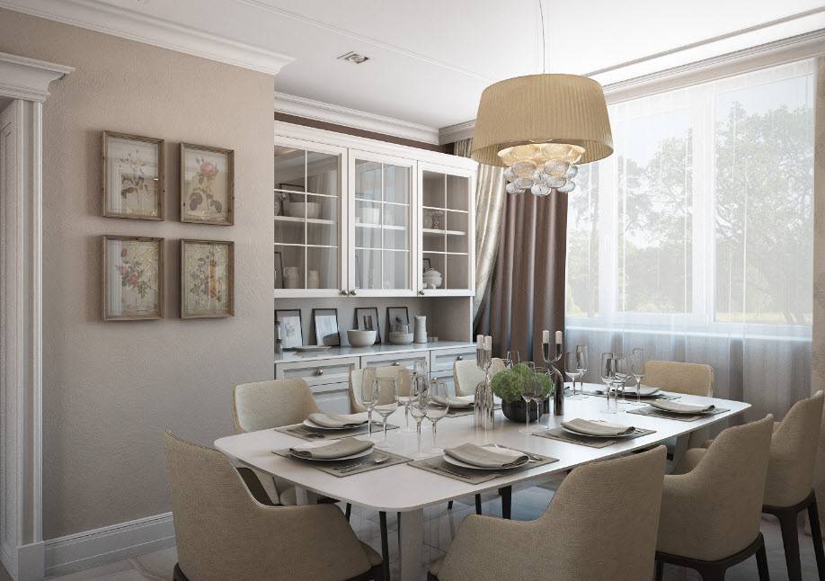 Такое помещение обычно бывает в элитных квартирах или частных домах. Если ваша цель создание статусного оформления, то можете выбрать Неоклассический дизайн столовой 2021.