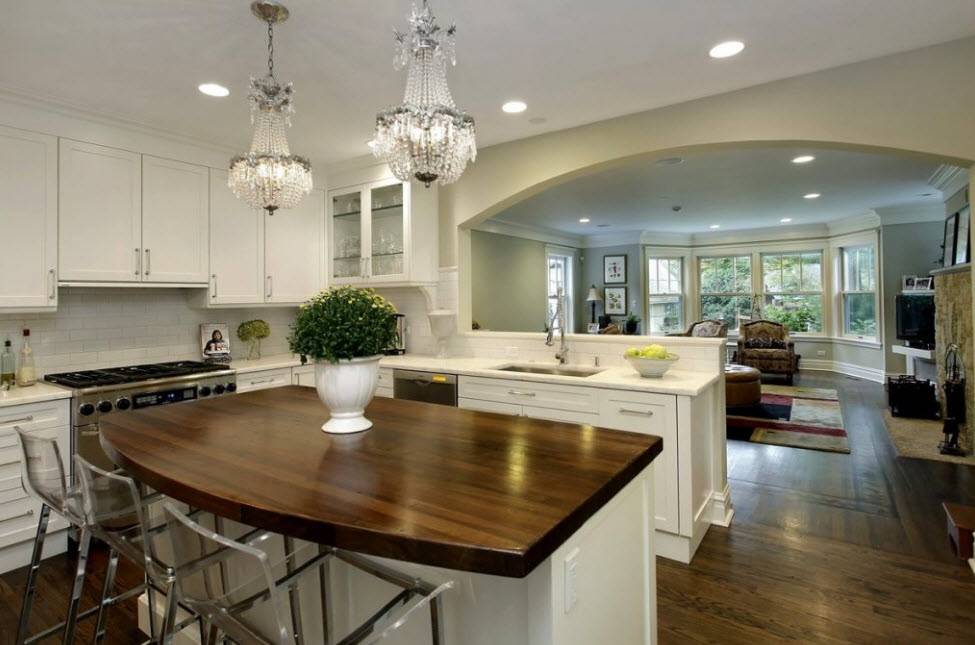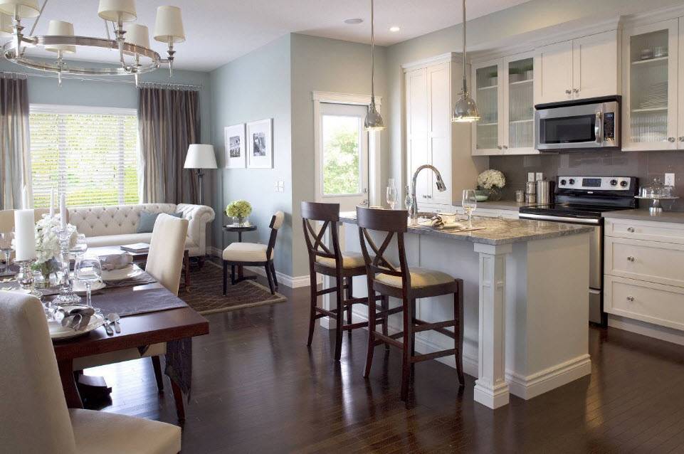 Если вы отказываетесь от большого стола в гостиной, следует выбрать кухонный остров. Помните, что зона, где вы будете есть, необходима. Предположение, что вы будете потреблять все обеденные блюда на диване, на практике неудобно, так как мешает приему гостей и оказывает крайне негативное влияние на личное здоровье.