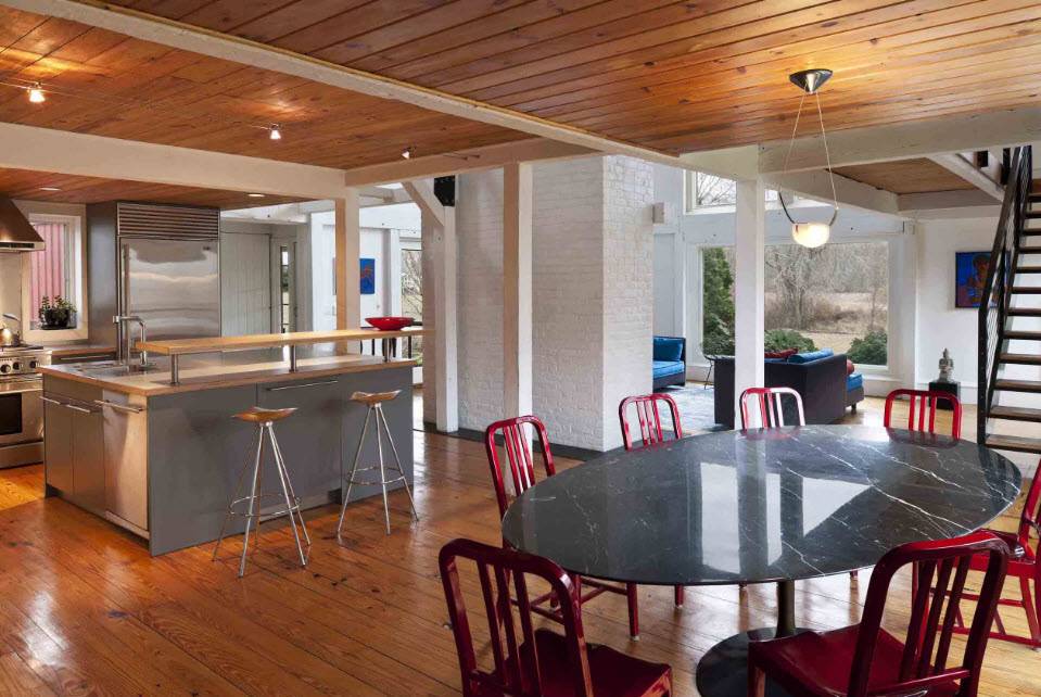 Наиболее распространенные решения в этом типе договоренности — зонирование кухни и гостиной. Это можно сделать, правильно расставив мебель. Границей может быть диван, кухонный остров, бар или стол. Стеклянные и складные стены, например, гармошка, также все чаще встречаются. Другой вариант установить границу — изменить напольное покрытие, сочетая дерево в гостиной с плиткой на кухне.