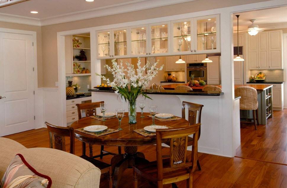 Для небольшой семьи есть масса вариантов того, как организовать удобную обеденную зону, после устройства которой еще останется визуальный простор и много места для свободного передвижения.