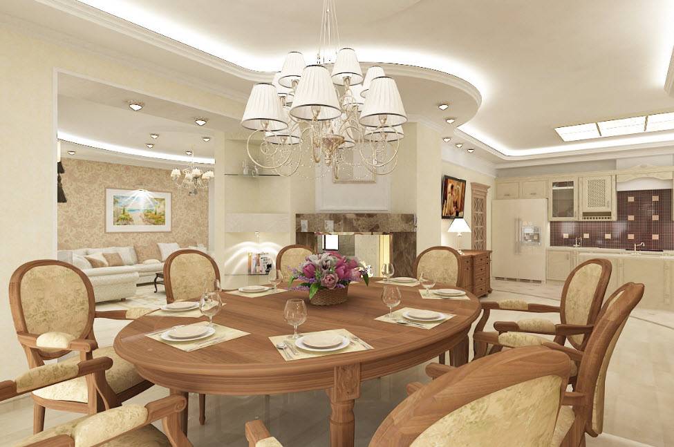 - Шикарная и большая люстра над столом (стеклянная, кованая или хрустальная).