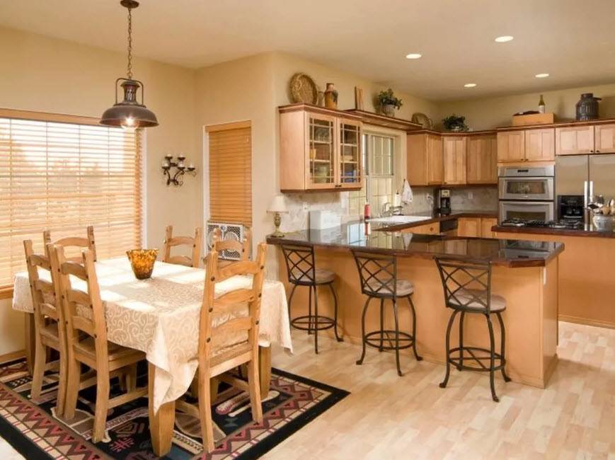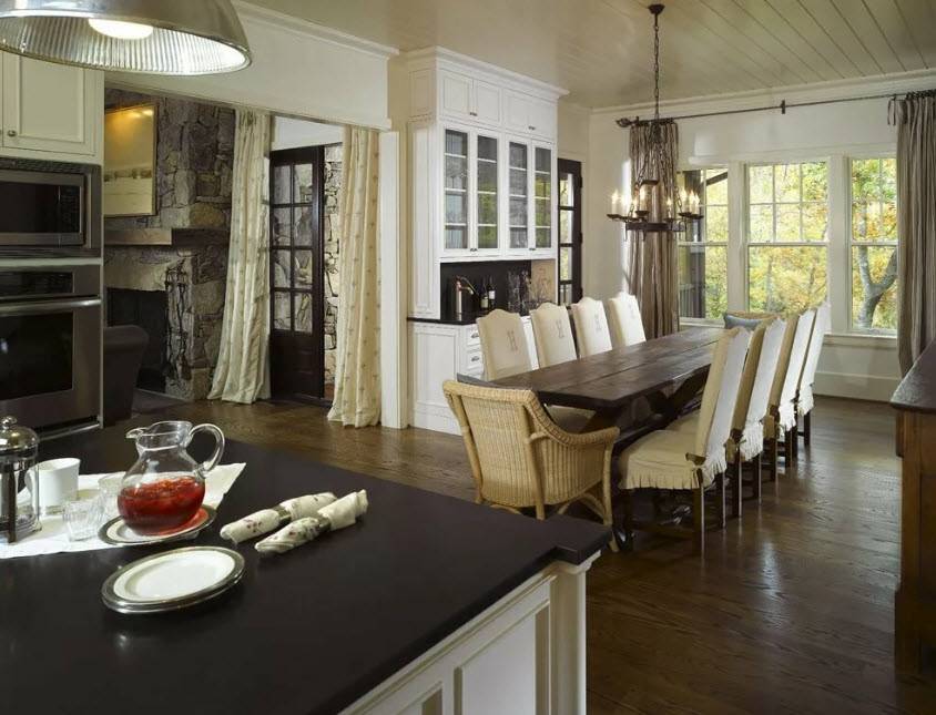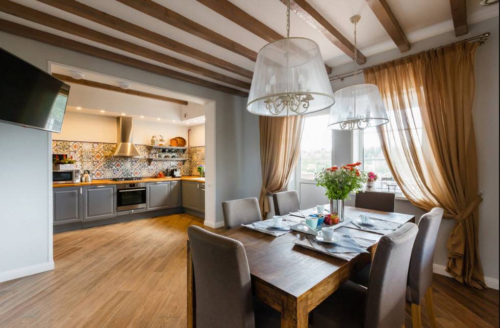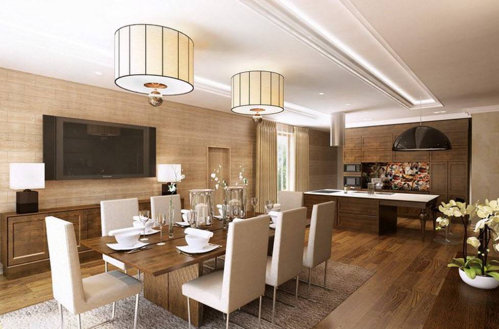 Сложнее придется тем, у кого совмещенная столовая. Ее оформление должно быть созвучно дизайну помещения в целом.