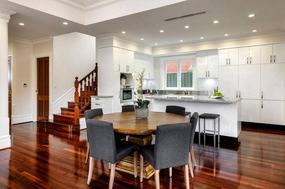 Идеальное расположение обеденной зоны – островное, когда стол стоит вдали от гарнитура и на оптимальном расстоянии от стен. Если в одном помещении находятся кухня и гостиная со столовой, целесообразно будет разместить большой стол со стульями посередине. В квартирах-студиях место для приема пищи может располагаться, где душа пожелает.