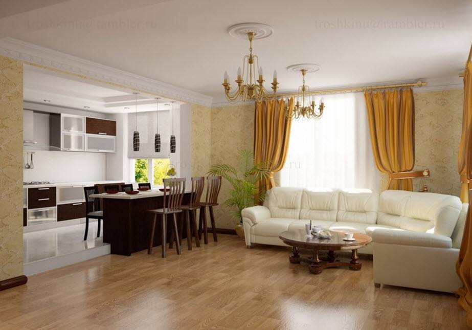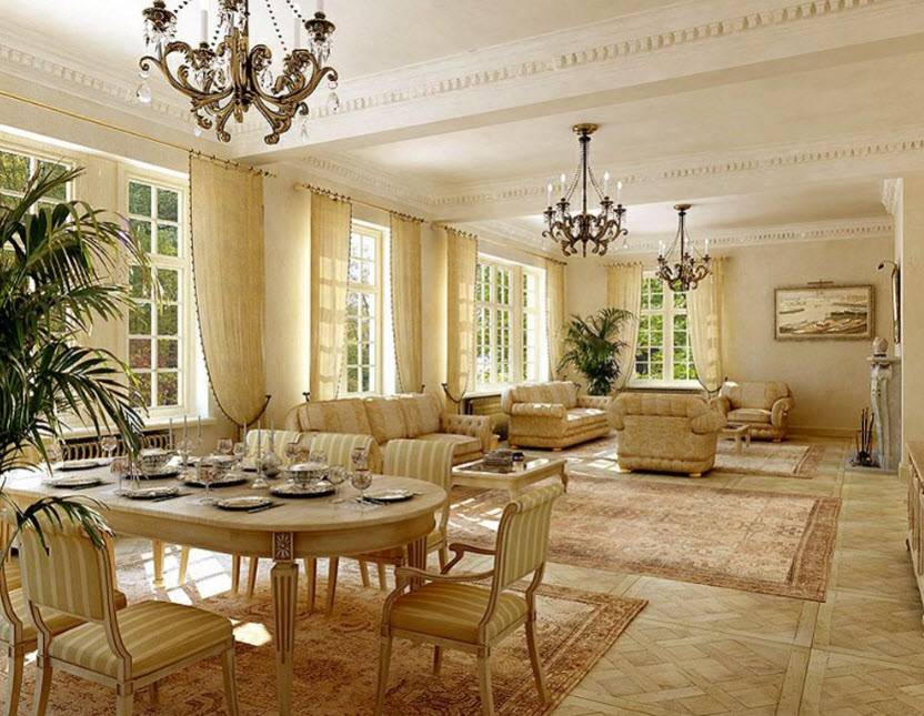Классический дизайн является одним из самых дорогих оформлений. Если вы планируете воплотить на своей кухне-гостиной настоящую классику, то будьте готовы потратить немалую сумму на элегантную качественную мебель и дорогие аксессуары.