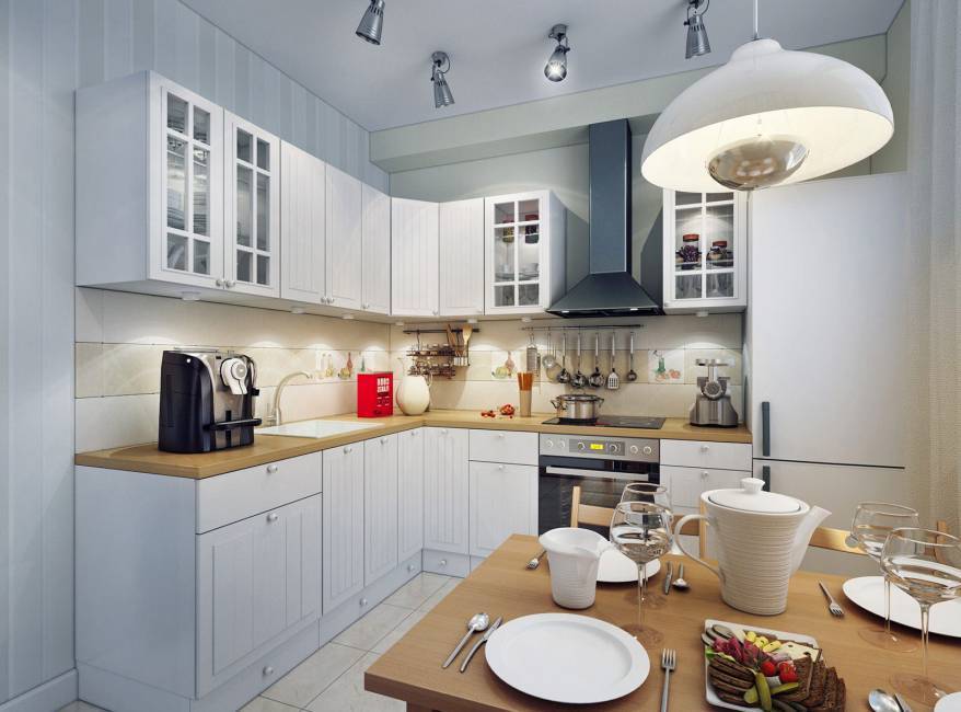 Добиться визуального расширения границ маленькой кухни можно с помощью хорошего освещения и светлых тонов отделки.