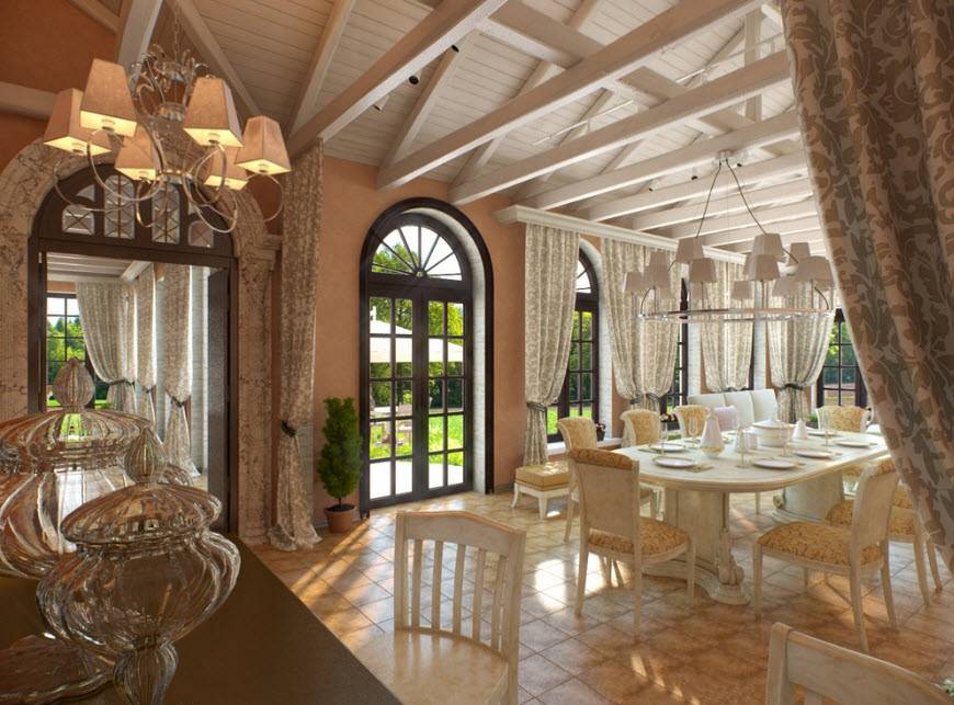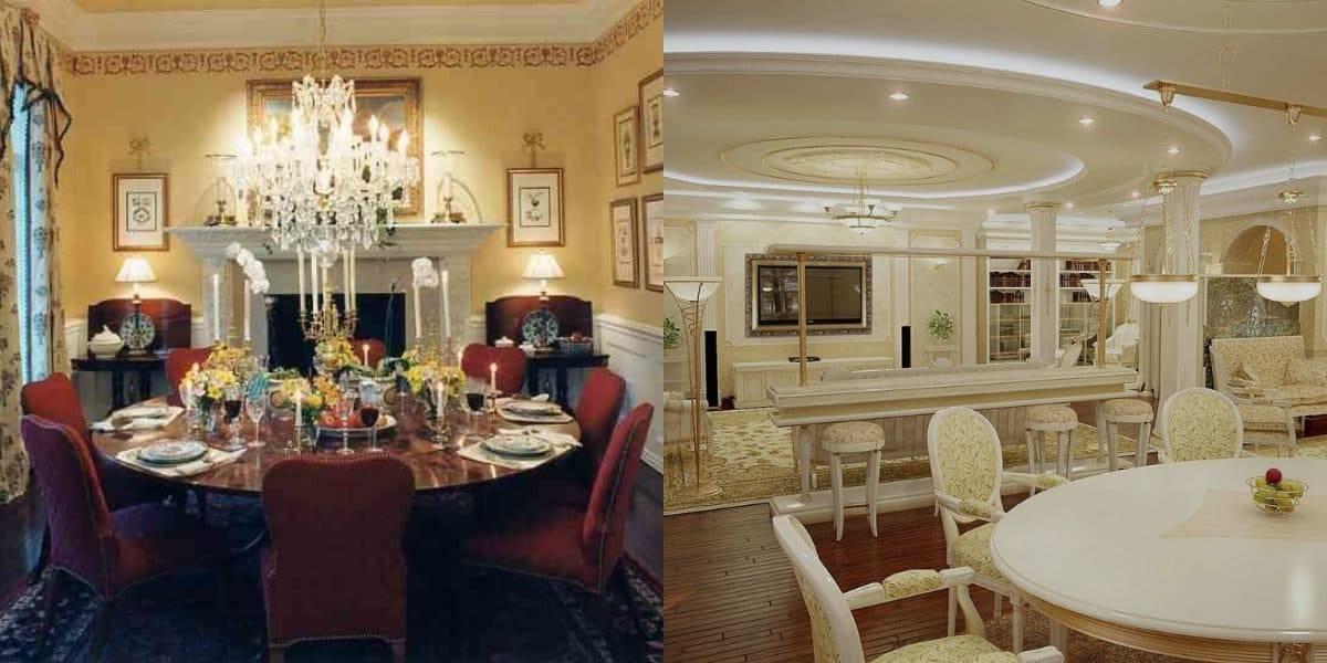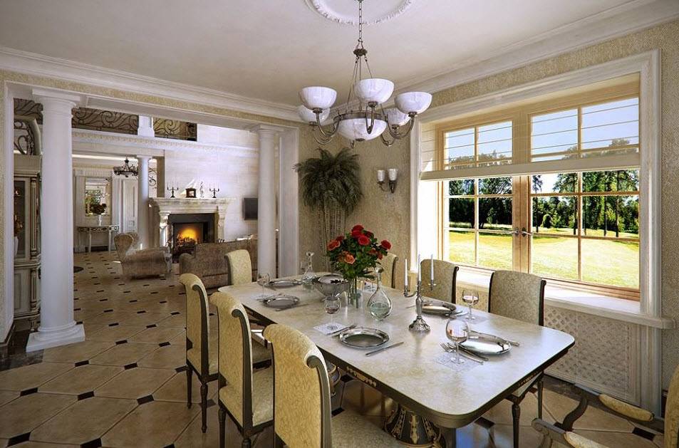 Что касается декоративных элементов и аксессуаров, то обязательными элементами столовой являются картины, зеркала и витрины с роскошной посудой. Также здесь найдут место ценные вещи и раритетные предметы, изысканные витражи и коллекционные вещи (марки, монеты и т.д.). Также здесь можно обустроить особые композиции, расположенные на открытых нишах с ненавязчивой подсветкой. Кроме того, нужно помнить о текстиле, ведь он создает уют и особую атмосферу внутри столовой. Еще один обязательный элемент – цветочный букет на столе, дарящий приятные эмоции и хорошее настроение.
