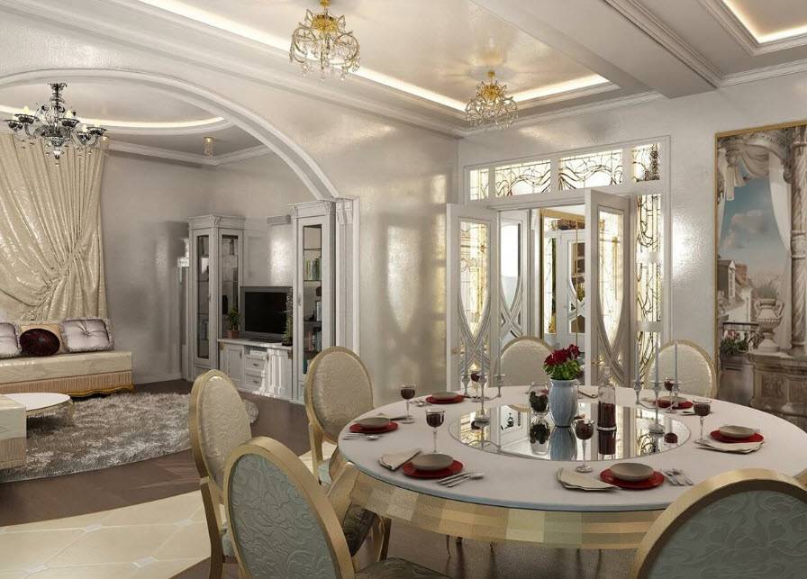 Если в комнате есть эркер, он идеально подойдет для обустройства обеденной зоны; семейные и торжественные обеды будут проходить в особенной атмосфере. В отсутствие эркера приходится импровизировать, и тогда разделение зон в интерьере гостиной столовой проводится следующими способами: