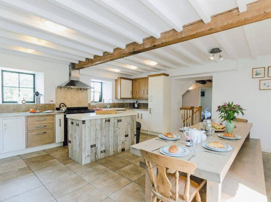 Можно сделать кухню-гостиную в английском стиле. Этот вариант подходит тем, кто предпочитает в дизайне консерватизм и некоторую сдержанность. Английский интерьер кухни — гостиной предполагает наличие следующих моментов:
