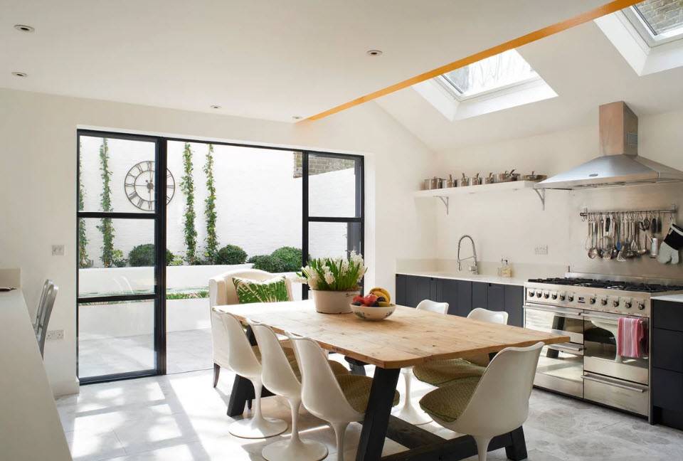 - Окно. Обеденную столешницу можно встроить прямо под окно, полностью охватив подоконник. Ширина зависит от свободного пространства. Если есть возможность, нужно довести стол до боковой стены. Вместо классических стульев, лучше выбрать высокие табуреты. При ненадобности они прячутся под стол. Также можно сочетать узкий столик под окном с двумя мини-диванчиками по бокам.