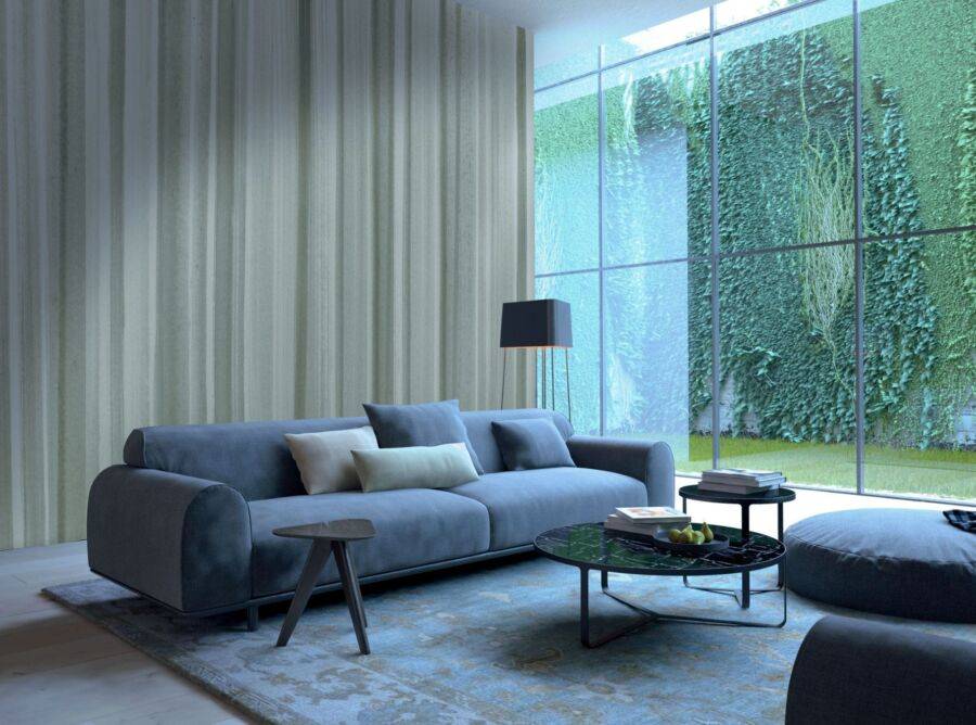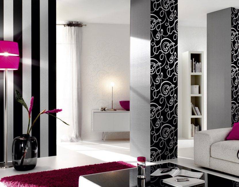Хорошо сочетаются однотонные и с рисунком в виде широких или узких полос. Такой декор визуально увеличивает высоту потолка и создает эффект более просторного помещения.