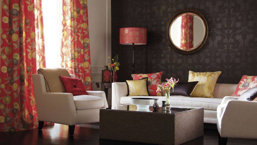 Чтобы зрительно увеличить пространство маленькой гостиной, рекомендуется применять светлый и блестящий текстиль. Шторы должны гармонировать с остальной отделкой, частично повторять рисунки на обоях, подчеркивать цвет стен или же сливаться с ним.