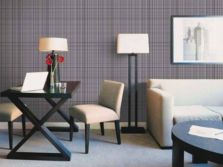 Рабочую комнату стоит отделать обоями, цвет которых будет стимулировать к деятельности, например синий или серый. Рисунок не должен быть отвлекающим или вызывающим, простого орнамента будет достаточно.