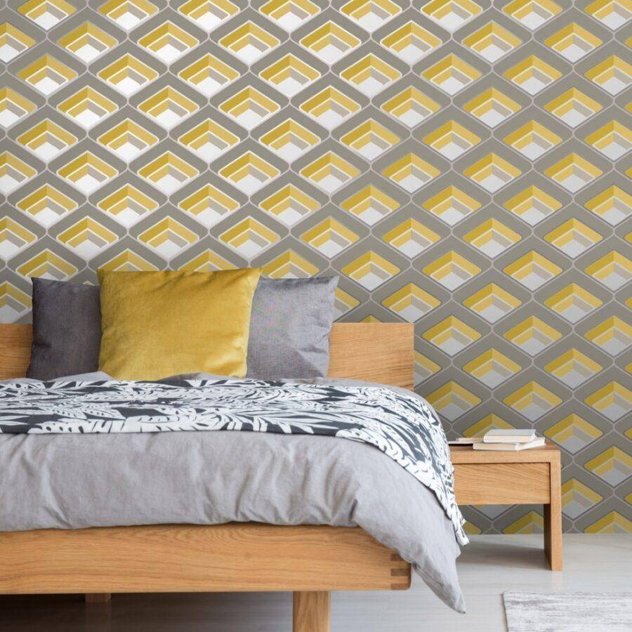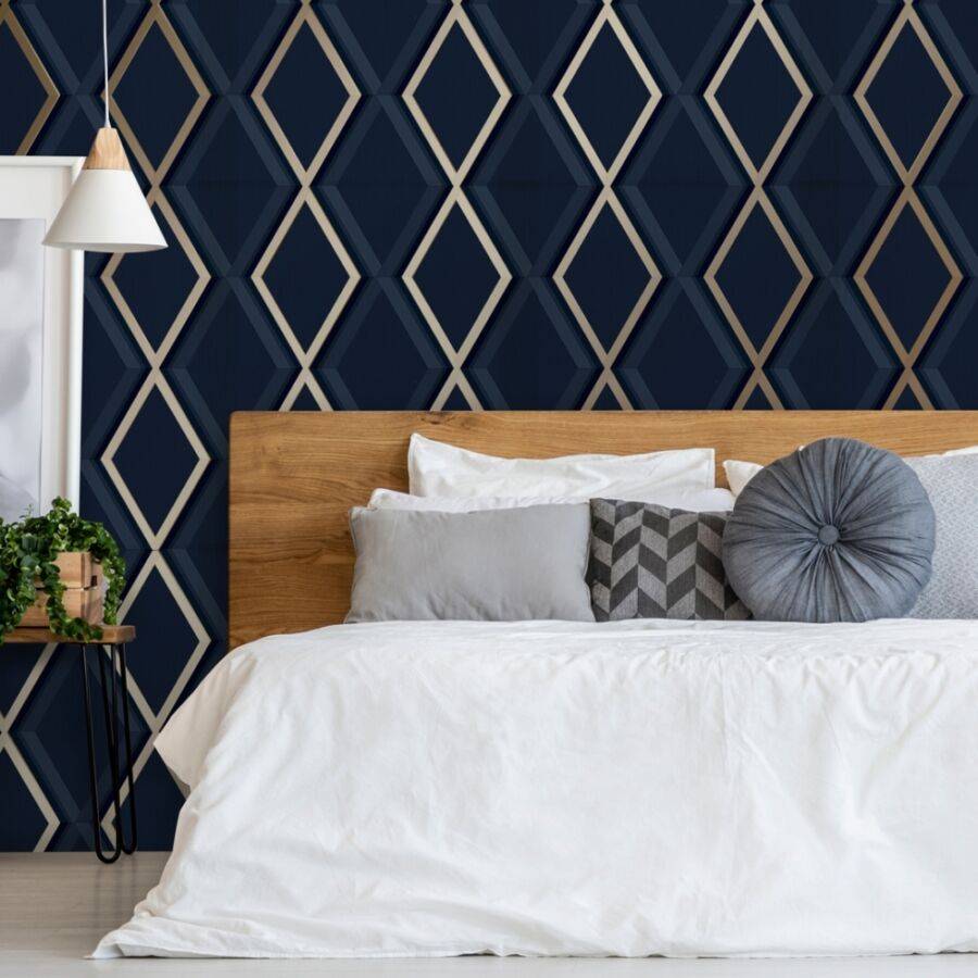 оформление акцентной стены в детской комнате мальчика обоями с геометрическим принтом