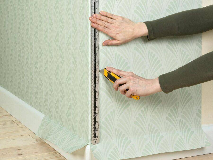 После поклейки обоев излишки материала, которые идут внахлест с полом и потолком, обрезают.