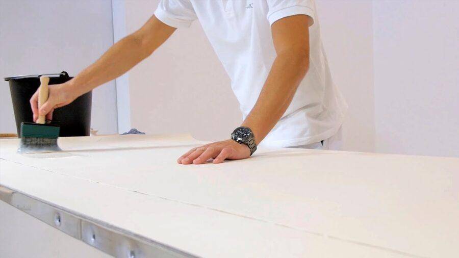Первую полоску приклеивают вдоль вертикальной линии, положение которой намечают специальными инструментами или грузиком. В процессе работы это делают еще несколько раз. Так на кривизну проверяют углы.