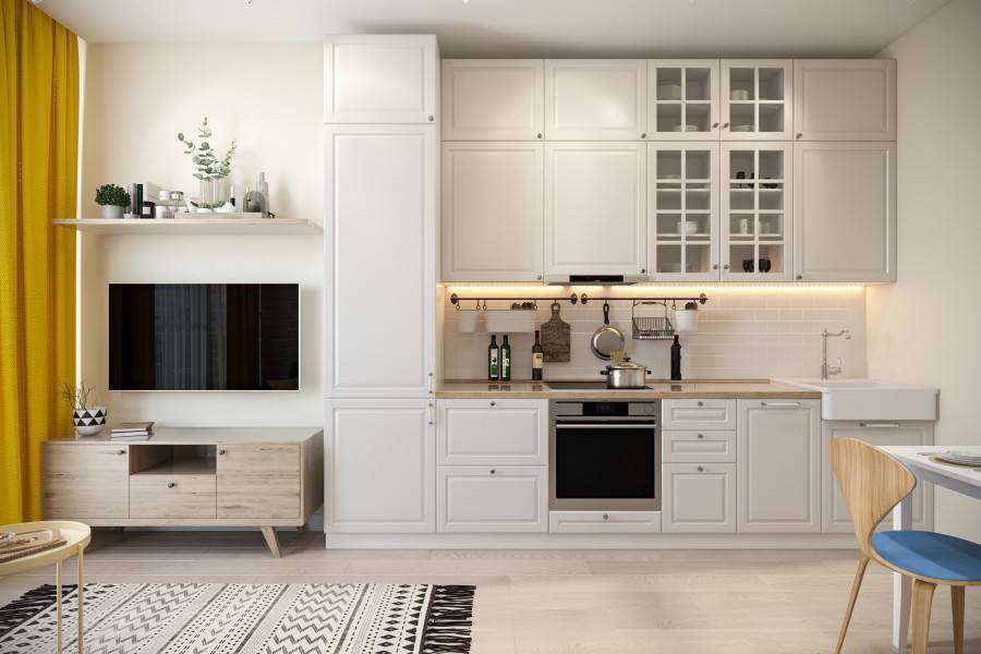 Кухня бывает совмещенной с гостиной (чаще для студии) или раздельной. Встроенный шкаф, минимальное количество предметов увеличат площадь для других нужд. При недостатке пространства в качестве стола приспосабливают подоконник или часть разделочной столешницы. Массивные стулья заменяют барными или другими компактными.