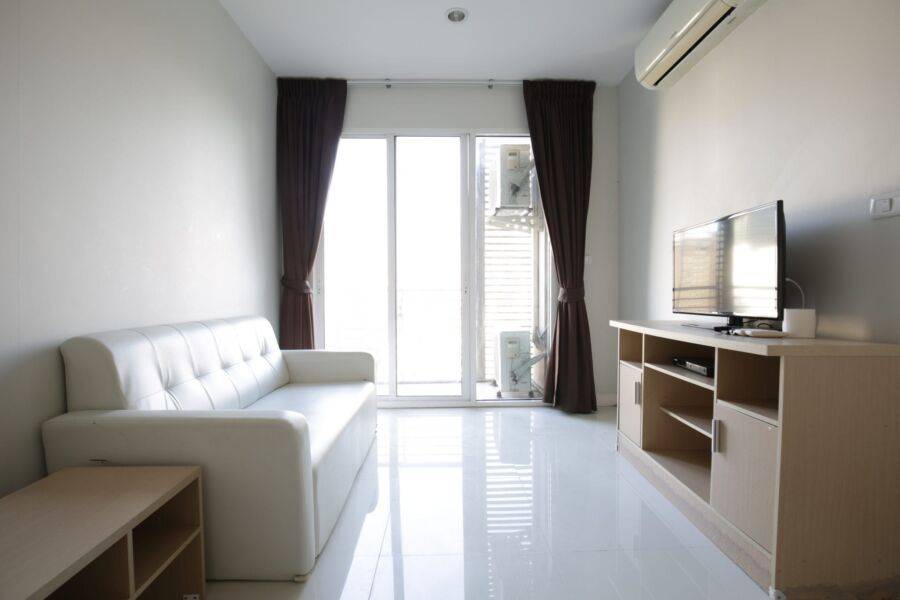 Белый цвет должен стать ведущим при декорировании комнаты, чтобы осветлить квартиру в целом. На площади разместится диван светлых тонов (белого, бежевого, кремового, серого, голубого), маленький стеклянный журнальный столик, небольшая тумба из светлого дерева и телевизор. Также можно позаботиться об акцентах – яркой стене (синего, серого, зеленого цвета).