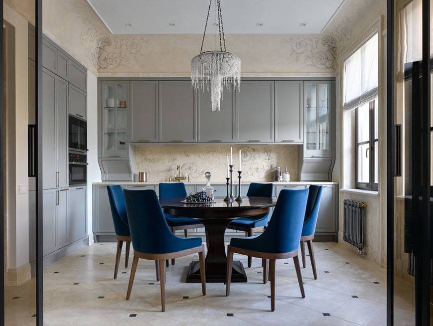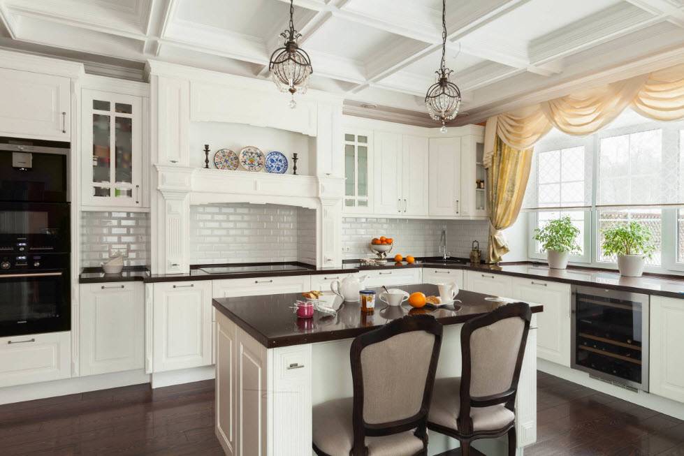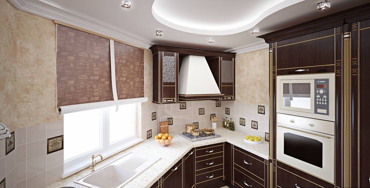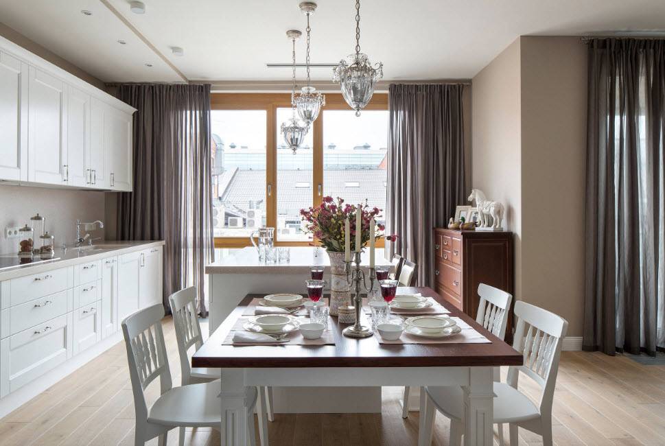 Если интерьер вашей кухни выполнен в классической стилистике, то выбрать шторы будет не сложно. В сочетании с благородной мебелью из натуральных материалов в теплых тонах можно выбрать тяжелые портьеры в пол. Актуальные оттенки классик – бежевый и коричневый.