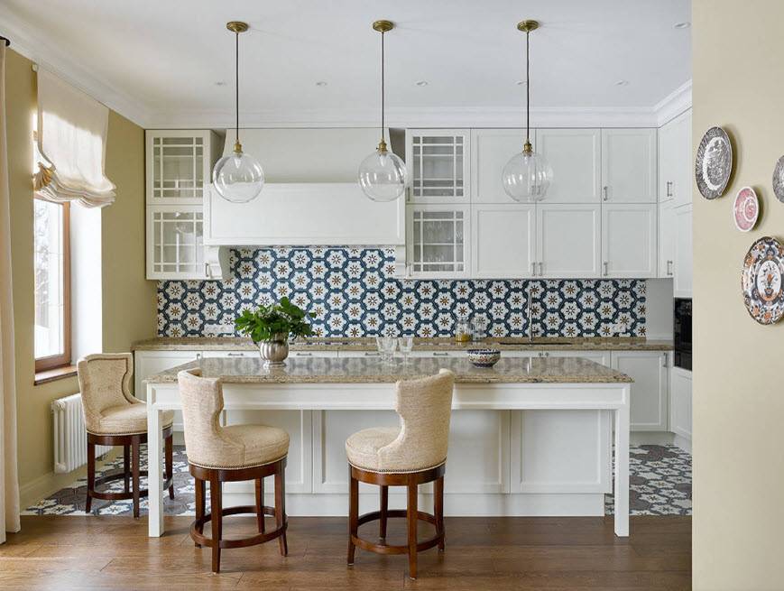 Кухня в стиле кантри с островом и рабочей зоной возле окна