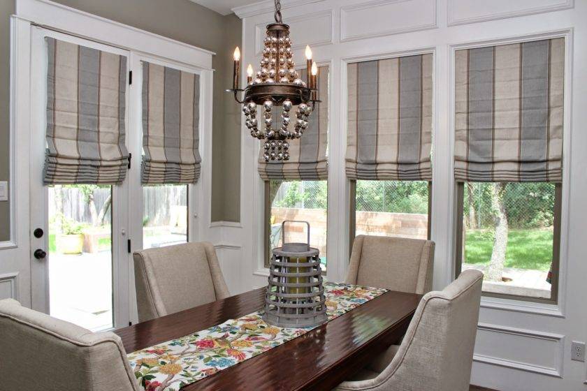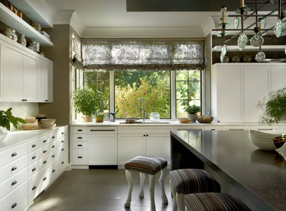 Оформление двух окон одной кухни не обязано быть одинаковым, но должно быть согласованным. Например, вы можете украсить окно в рабочей зоне римскими шторами, а в зоне столовой – комбинацией из тех же римских штор и портьер.
