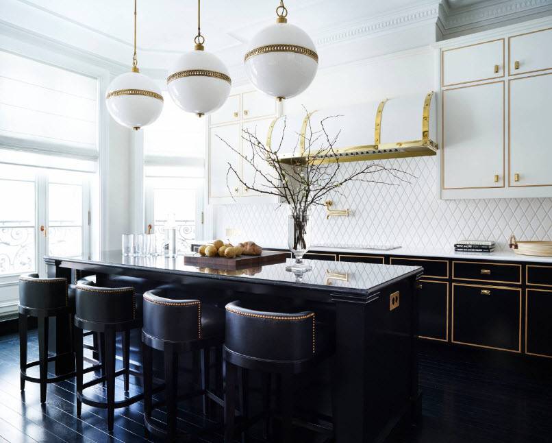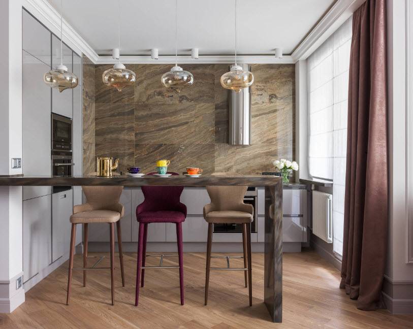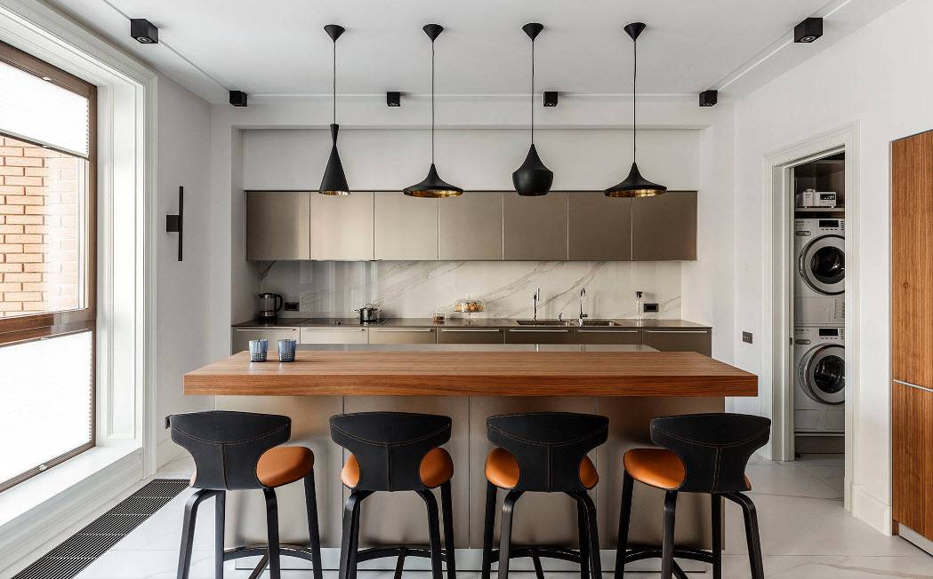 Часто в кухнях, объединенных с гостиными, между окнами образовывается простенок, который отлично подходит для размещения барной стойки, острова или обеденного стола.
