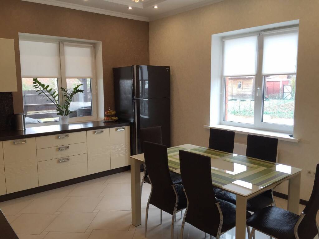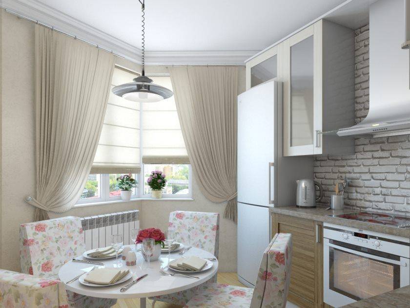 Дизайн кухни с двумя окнами, оформленными одинаковыми шторами