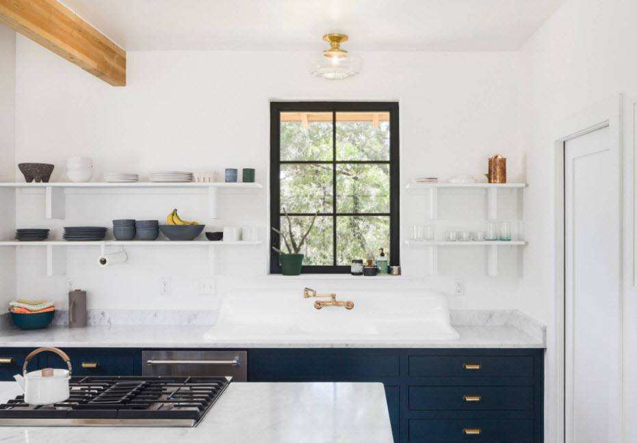 Верхний ярус шкафов можно продолжить по всему периметру, либо сделать открытые полки, если места для хранения достаточно.