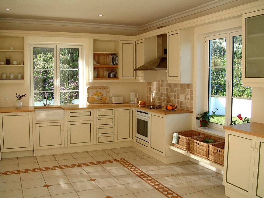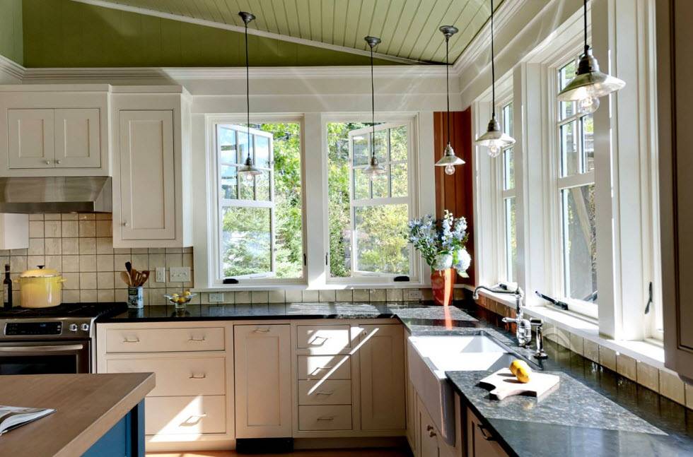 Такой вариант планировки позволяет хозяйке любоваться видом из окна, а также маскирует радиаторы в комнате. Размещая мойку рядом с окном, необходимо внимательно обдумать детали, перед начало монтажа.