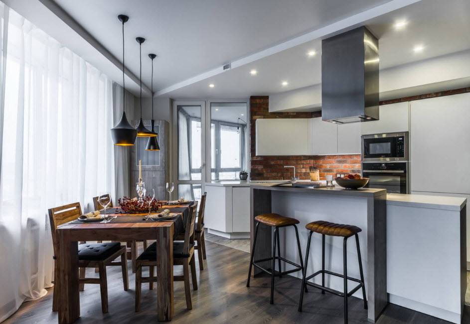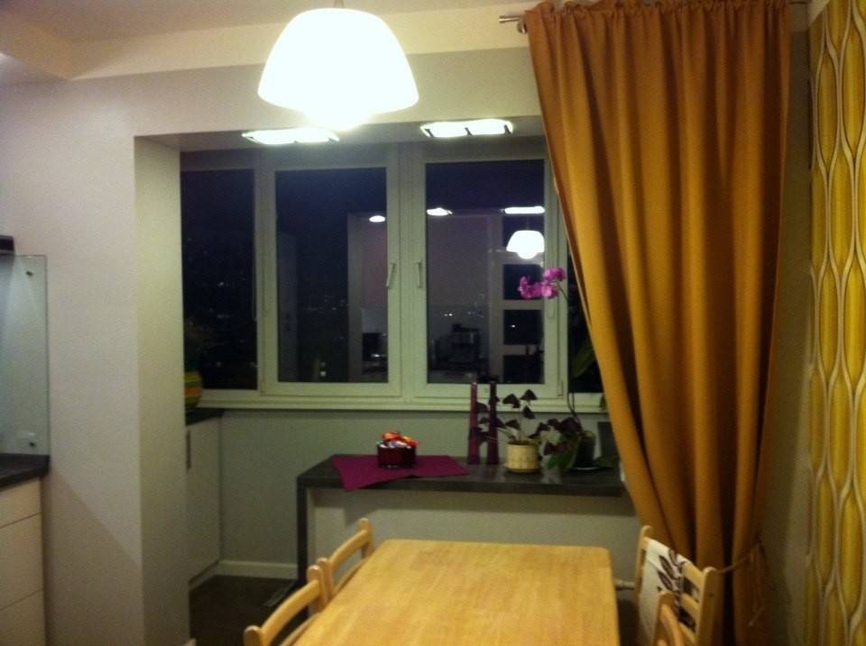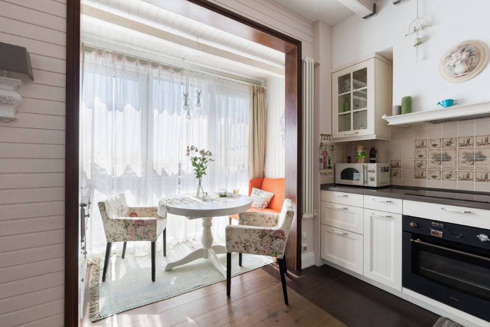 Сейчас пользуется популярностью практика демонтажа балконной двери и оконной рамы. Помещения объединяются, что становится спасением для маленькой кухни. Она находит свое продолжение или же плавно перетекает в отдельную столовую, цветущий сад, кабинет, комнатку отдыха. Такой нехитрый прием, по комментариям дизайнеров, связан не только с желанием расширить жизненное пространство, но и с появлением моды на совмещенные помещения. Ведь балкон на постсоветском пространстве использовался исключительно в качестве «кладовки для хлама». Непростительная роскошь, когда каждый квадратный метр можно модернизировать и применять с пользой. Естественно такая перепланировка возможна только в тех случаях, когда балкон утеплен должным образом, чтобы температурный режим был одинаков в обоих помещениях. Бывший подоконник переделывают в барную стойку, столовую зону или специальную нишу с полочками для декоративных элементов. Проем под балконную дверь завешивают легкими нитяными шторами или драпируют тканью по периметру.