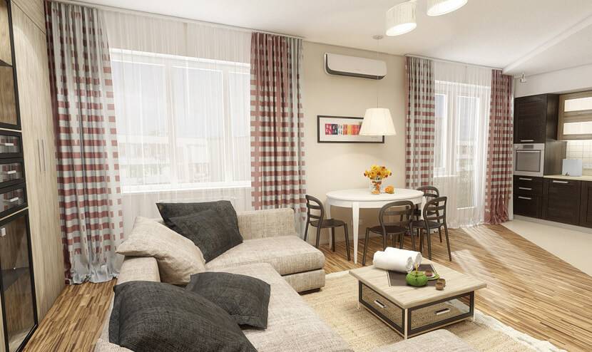 - Кухня-гостиная с двумя окнами и балконной дверью