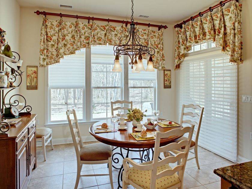 Дизайн штор на кухню в стиле кантри предполагает большого количества текстиля. Подчеркнуть следует то, что скатерть, салфетки, шторы должны быть не только одинакового цвета, но и из одного материала. Такое соединение подчеркивает уют, создает тихую и приятную атмосферу. Выберете светлые тона кремового, белого, но с рисунком. Это может быть клетка, цветок, животные, овощи и фрукты.
