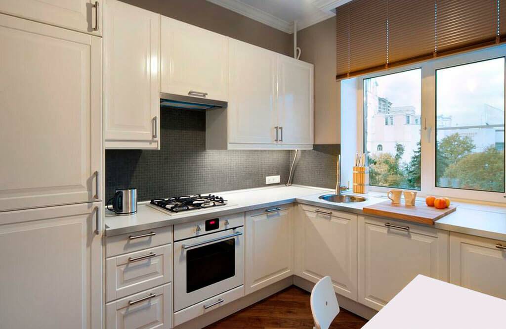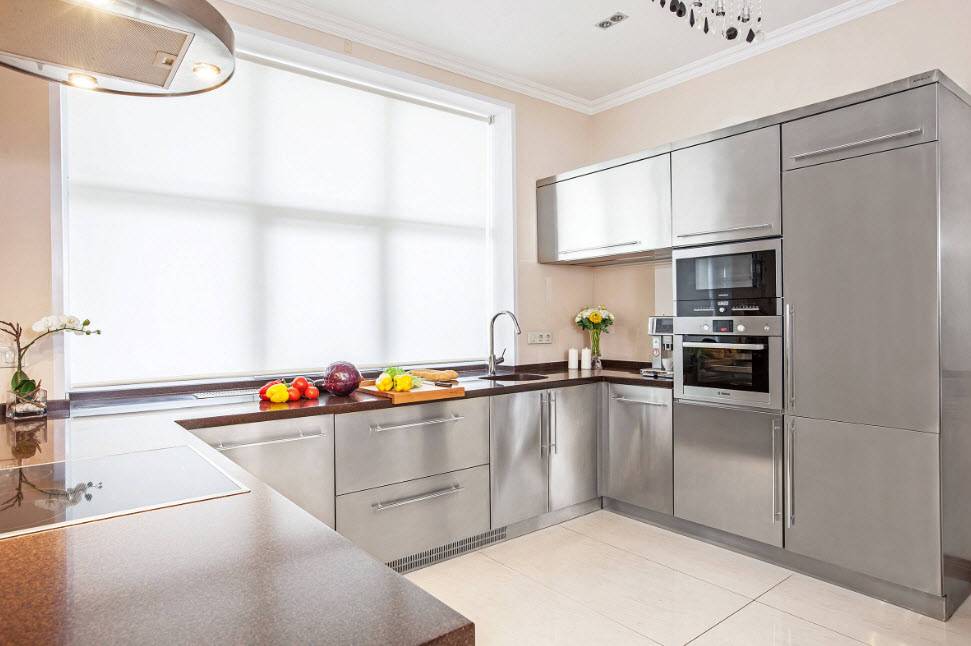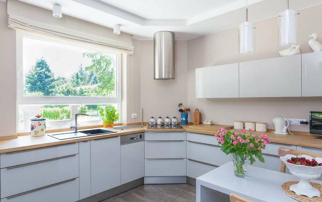 Минимализм в угловом гарнитуре с мойкой напротив окна