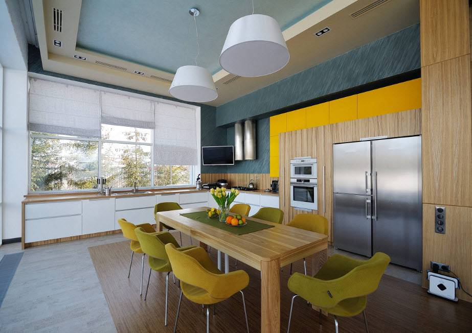Сегодня именно рабочая зона у окна — это самый популярный дизайн проходной кухни в частном доме. В плане экономии на освещении такое решение считается мудрым. Необходимо иметь в виду, что в этом случае столешница и кухонный стол не должны перекрывать окно. Также нужно учесть, что рабочая зона и окно сольются в единую конструкцию, к стеклу будет примыкать столешница. Тюль не подходит, наиболее уместны в этой ситуации жалюзи или рулонные шторы.