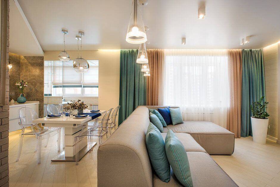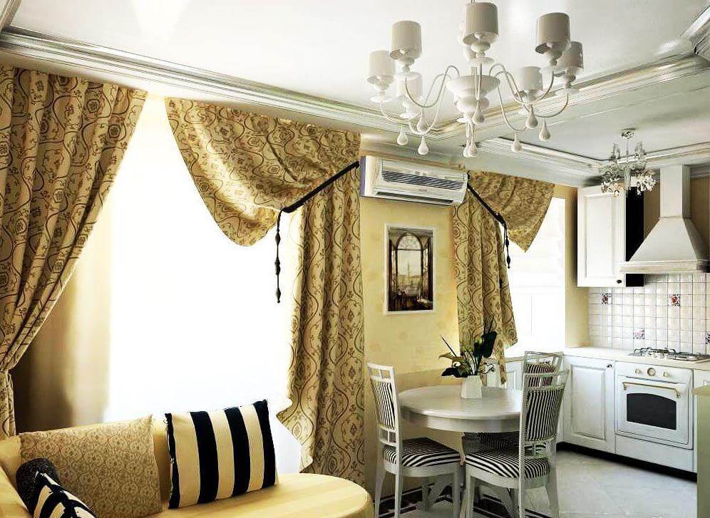Кухня, совмещенная с гостиной — интересное решение, которое требует продуманного дизайна и декора. Главный вопрос, на который предстоит ответить — будут ли разные зоны выполнены в одном стиле или нет? Исходя из этого можно дальше выбирать длину, цвет и ткань шторы, не забывая про баланс между практичностью и красотой. В таком случае занавески сделают комнату гармоничной, будут долго служить и радовать своим внешним видом.