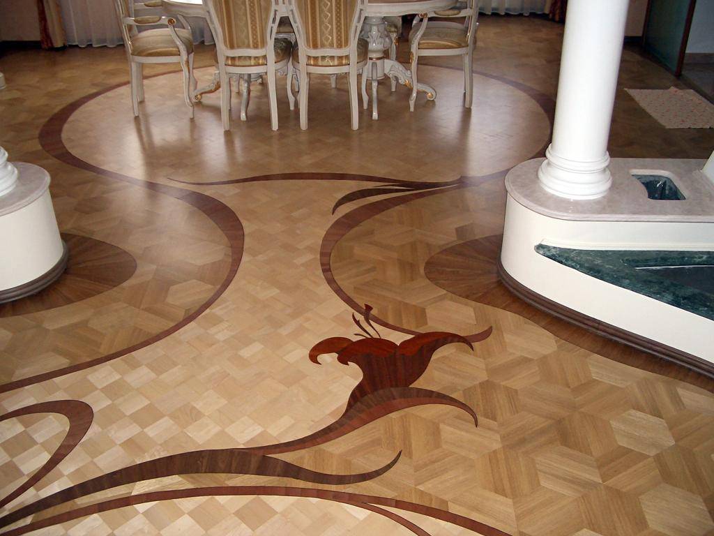 Вариантов рисунка паркета также предостаточно: шахматный узор, «палуба», плетенкой, елочкой и т.д. Плюсами здесь являются привлекательный вид, надежность, универсальность. К минусам можно отнести неустойчивость к повышенной влажности и резким перепадам температуры, в частности, если на паркет упадет что-нибудь очень горячее, без сомнений, останутся следы.