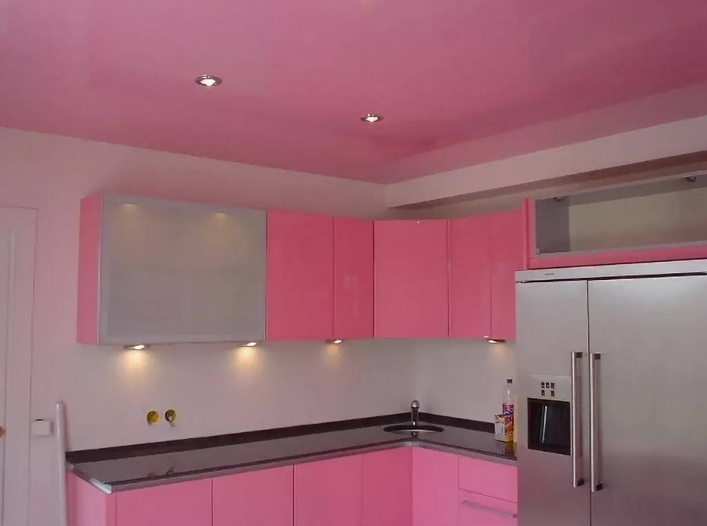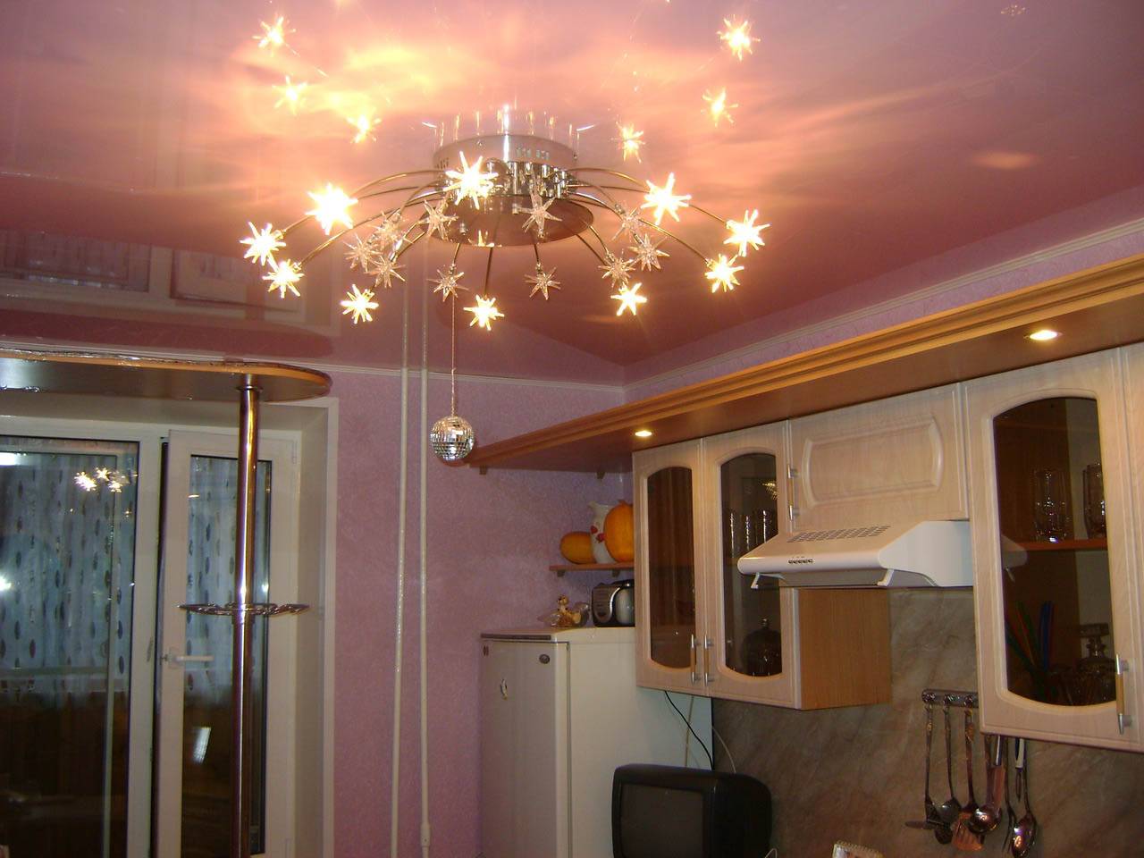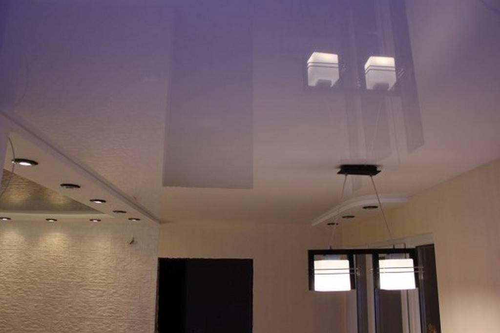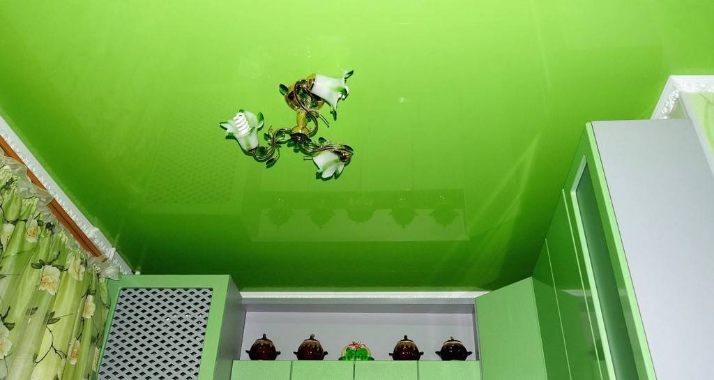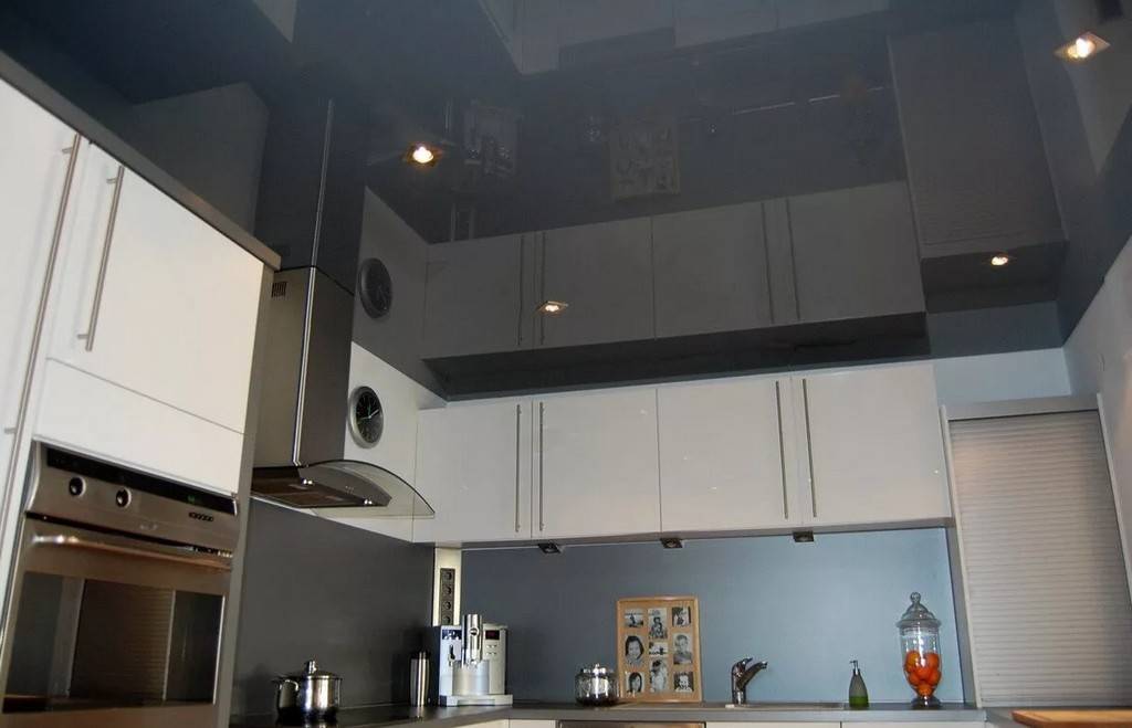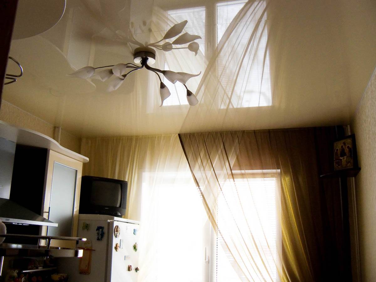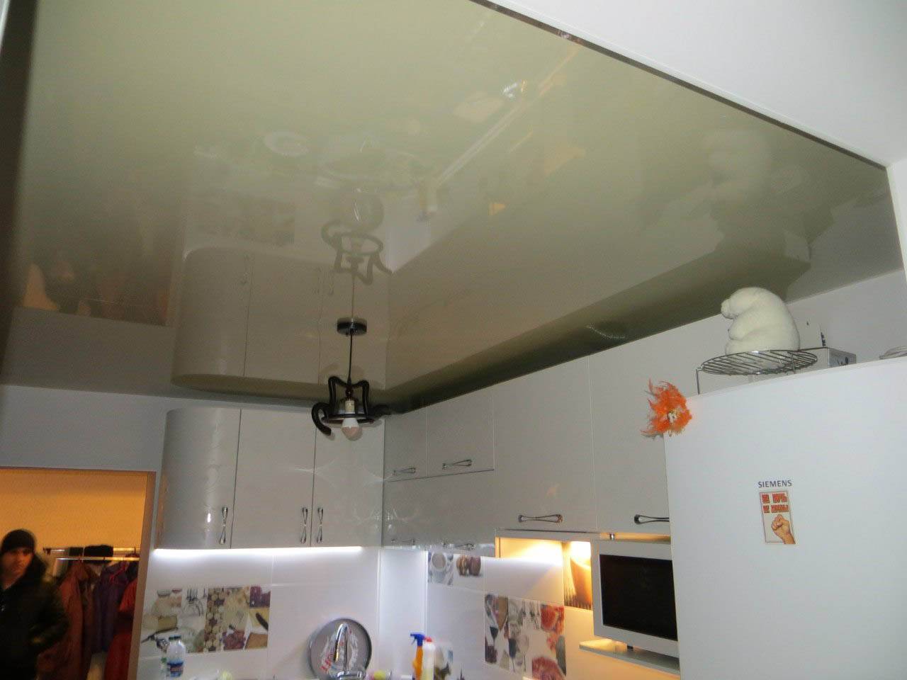 Пожалуй, это наиболее подходящий вариант, поскольку глянцевые поверхности проще всего в уходе, их легко мыть, они не впитывают в себя жир и грязь и не задерживают их на поверхности. Глянец отражает свет, что приближает поверхность такого потолка по свойствам к зеркальной. Он способствует увеличению освещенности, кухня кажется просторнее.