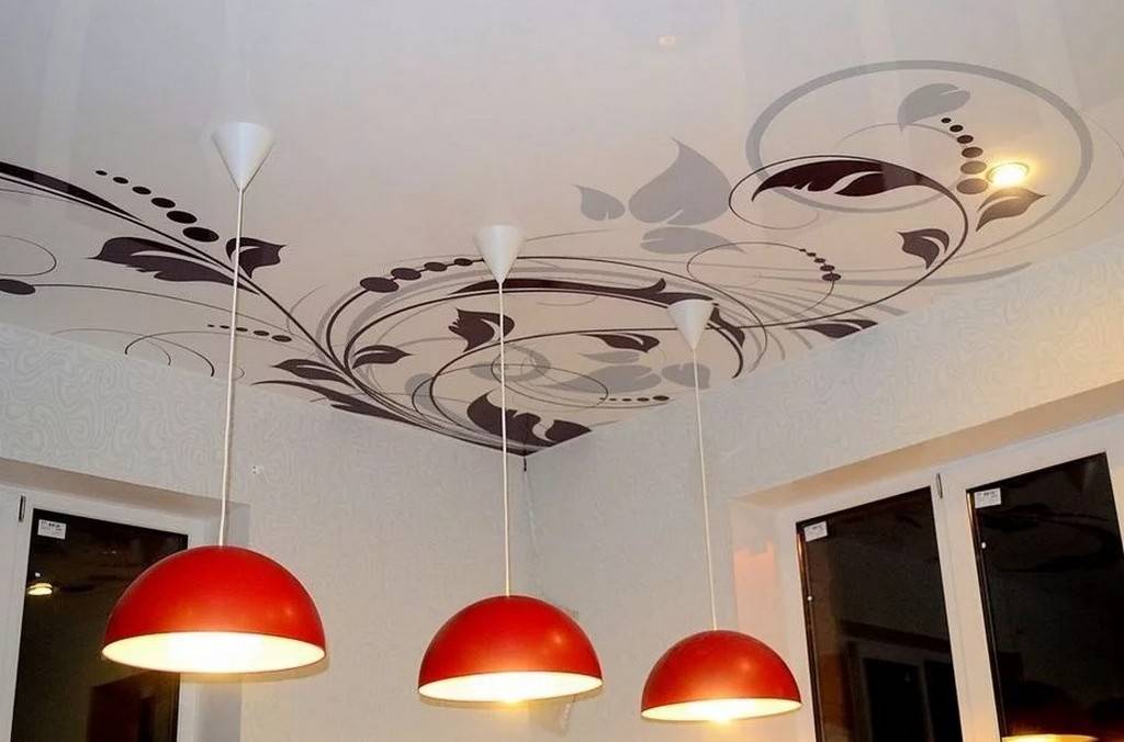 Использование различных рисунков придает дизайну натяжного потолка эксклюзивность или подчеркивает тематику кухни. С их помощью можно достигать необычных эффектов: например, поместив на потолке изображение пролета моста, можно оказаться «под мостом».