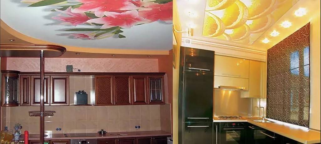 На материал, из которого изготавливают натяжные потолки на кухню, можно нанести любое изображение. Делается это методом фотопечати. Грамотный подбор рисунков для нанесения может полностью преобразить помещение, исправить его пропорции, сделать светлее или наоборот, убрать излишнюю освещенность, если кухня выходит на южную сторону и имеет большие окна.