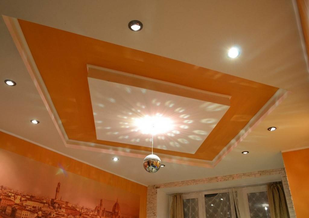Эта комната обычно самая большая в доме, и здесь самое подходящее место для объемных потолков, необычного декора и разнопланового освещения. В гостиной нередко используется прием оформления различных зон фигурными элементами. Чаще всего выделяют пространство камина, телевизора, большого дивана, обеденного стола. Если вы планируете устроить многоуровневый потолок в небольшой гостиной, от большой сложной люстры стоит отказаться в пользу аккуратного плафона.