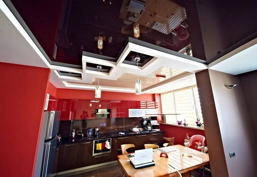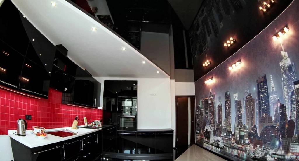 Черные оттенки можно использовать в просторных светлых залах и офисе. Лучше ограничиться небольшой глянцевой вставкой на фоне красного или белого потолка.