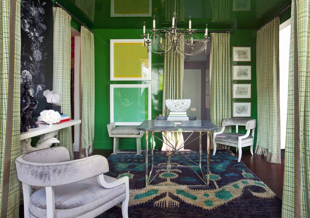 Зеленый цвет расслабляет и дарит покой. Это хорошее решение для отделки потолка спальни и зала. Яркая зелень добавит ощущение лета и энергии вместе с желтыми шторами и ковриком.