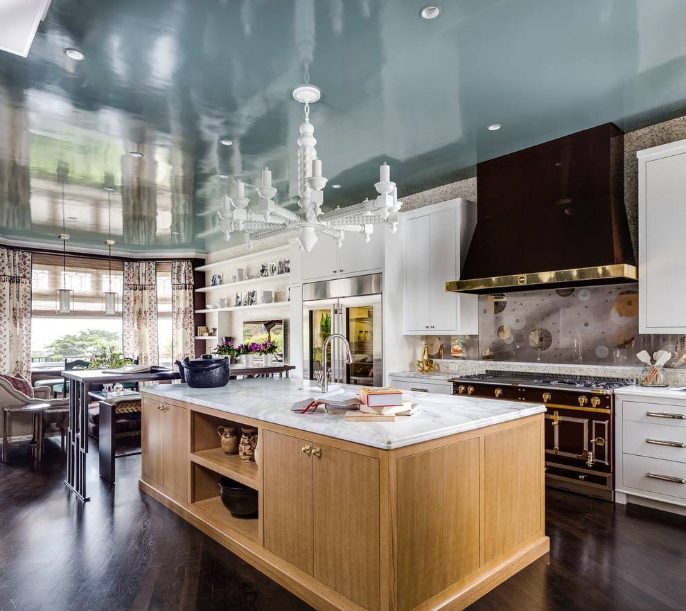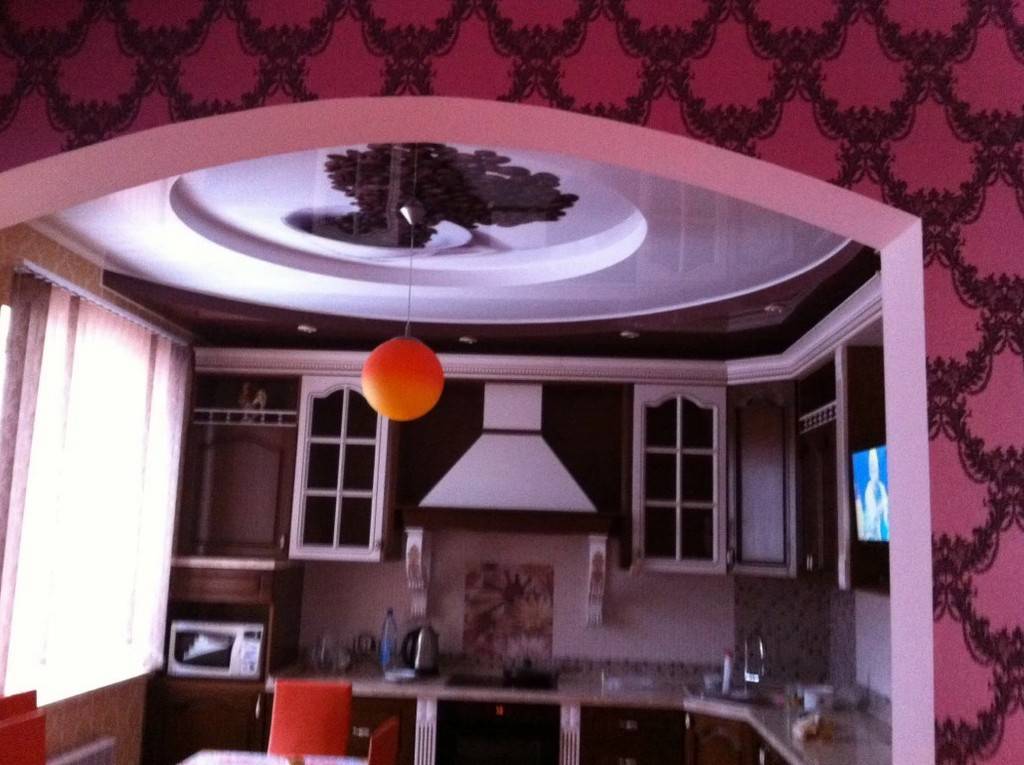 Натяжные потолки с фотопечатью идеально подходят для просторной кухни, хотя это уже несколько и вышло из моды. Тут работает вполне логичное правило: чем просторнее ваше помещение, тем крупнее могут быть объекты на вашем полотне.