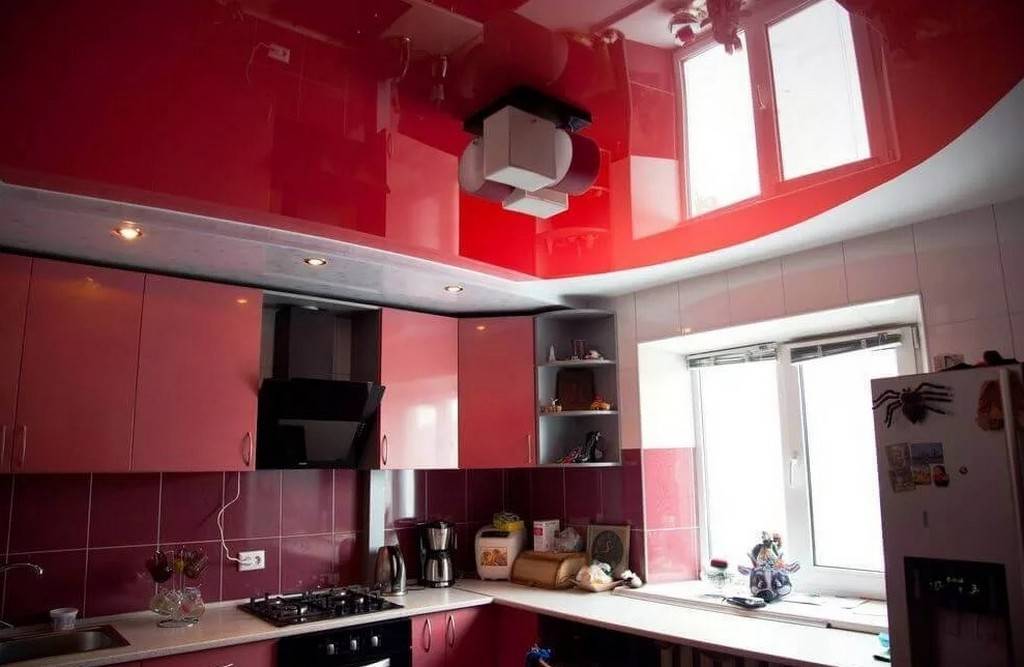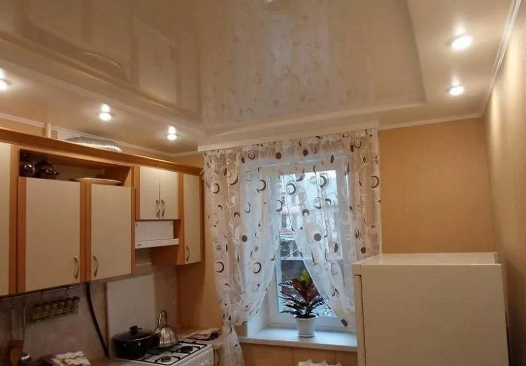Натяжные потолки на маленькой кухне могут оказаться самым приемлемым и бюджетным вариантом. Полотно должно гармонировать с интерьером самого помещения, чтобы не выделяться на общем фоне. Можно рискнуть и создать двухуровневую конструкцию, но стоит помнить о том, что в таком случае высота потолка значительно уменьшится.