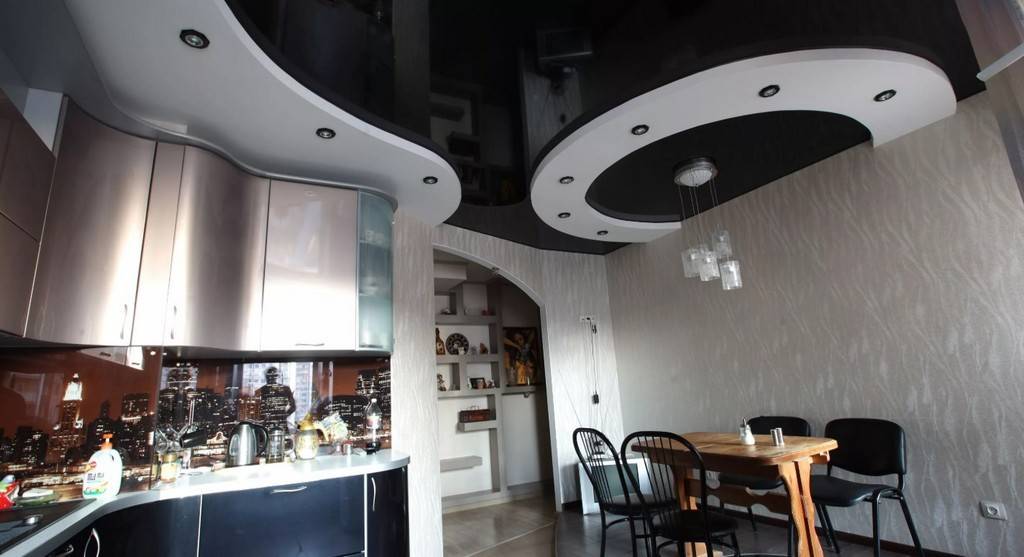 в отдельных случаях дополнительный объем потолочным конструкциям придается за счет комбинирования гипсокартона и натяжных полотен по схеме “листы гкл по периметру – овальный центр под пвх”;