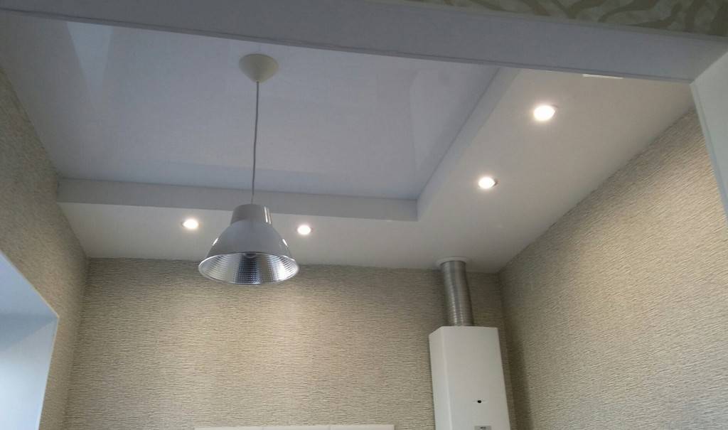 Если же кухня у вас довольно большая, появляется вероятность того, что потребуется двухэтапный монтаж натяжной пленки.