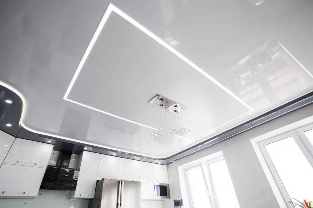 Белый глянцевый натяжной потолок создает ощущение чистоты и простора. Подходит для маленьких помещений и комнат без хорошего дневного освещения. Белый можно брать как основной, который будет разбавлен другим оттенком или комбинацией на втором уровне.