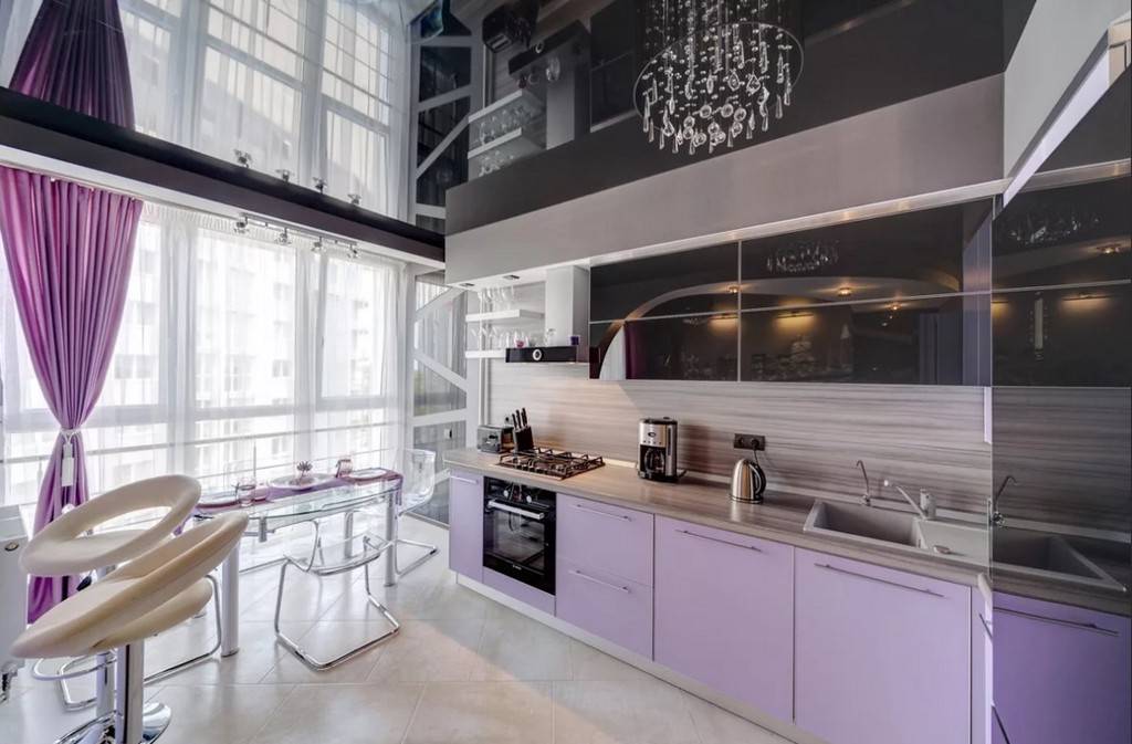- Глянцевые поверхности. Один из самых незатейливых способов зрительно приподнять потолок. Лучше всего срабатывает глянец именно на потолке. Когда зеркальная поверхность потолка отражает предметы на кухне: пол, окно с его естественным освещением создается ощущение, что пространство продолжается в высоту. Этот прием стоит учитывать, когда кто-то решает сделать на кухне натяжной потолок. Производители предлагают выбрать не только желаемый цвет ПВХ-пленки, но и глянец или матовость потолка. Если вы видите необходимость зрительно поднять потолок в своей кухне, то ваш вариант – глянец. Кроме того, в таком случае вы получаете небольшой бонус – вы можете отказаться от традиционно светлого потолка, а сделать его более насыщенного, и даже темного, цвета.