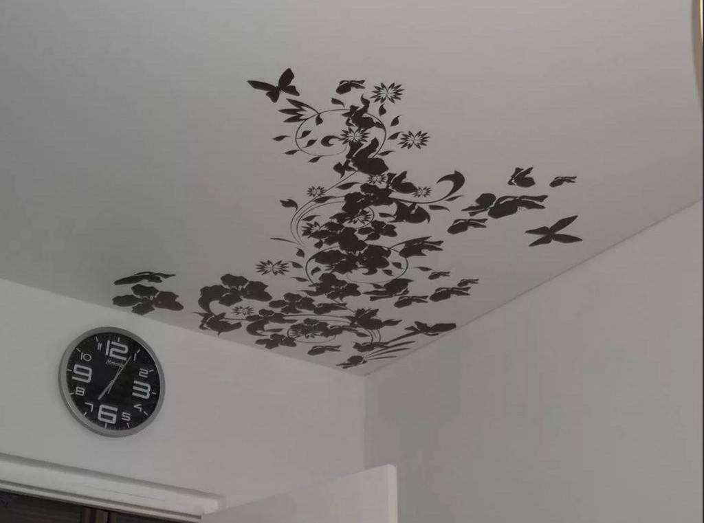 На фото рисунок бабочки расположен в углу потолка с матовым покрытием.