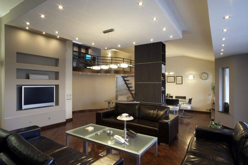 Точечные светильники можно расположить в любом количестве и любой форме по периметру потолка, они не нагревают современные потолки, что им противопоказано. Поворотные модели могут направлять освещение в разные стороны.