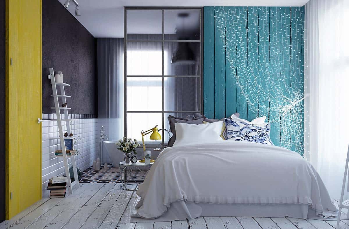 Необычные материалы используют для создания акцентных зон, и комбинируют их с простыми материалами. Так, например, изголовье кровати можно выделить с помощью кирпичной кладки или пластиковых панелей с оригинальными узорами.